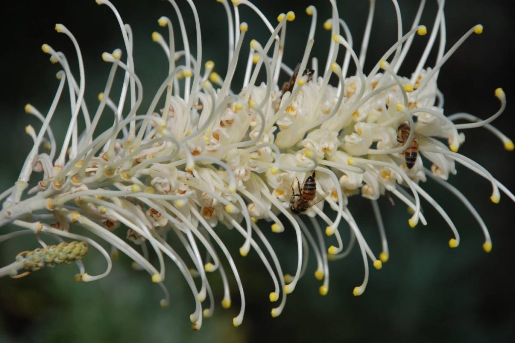 This Australian plant is sometimes called Desert Spider Flower. Desert grevilleas have long, narrow leaves that look like slender fingers and clusters of small, tube-shaped flowers in shades of red, orange, white, or yellow. The leaves on this plant have a waxy coating that reduces water loss and reflects sunlight to prevent overheating in the desert’s soaring temperatures. Desert Grevillea flowers (pictured in the close-up photo above) are rich in nectar and attract a variety of pollinators, including birds, bees, and butterflies, making them important contributors to desert ecosystems in Australia.