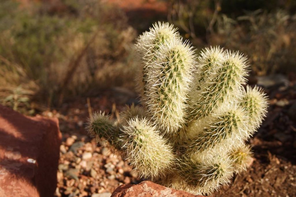 There are several types of cacti known as “chollas,” all in the Cylindropuntia genus. In general, cholla cacti have segmented stems covered in clusters of sharp, barbed spines that resemble fuzzy balls or branches covered in tiny needles. Chollas’ dense spines provide shade for its stems, helping reduce water loss by creating a “microclimate” around the plant that’s cooler than the surrounding area. Some cholla cacti have detachable stem segments, which easily cling to the fur of passing animals or to unsuspecting hikers. Because of this, these chollas are sometimes referred to as “jumping” chollas.