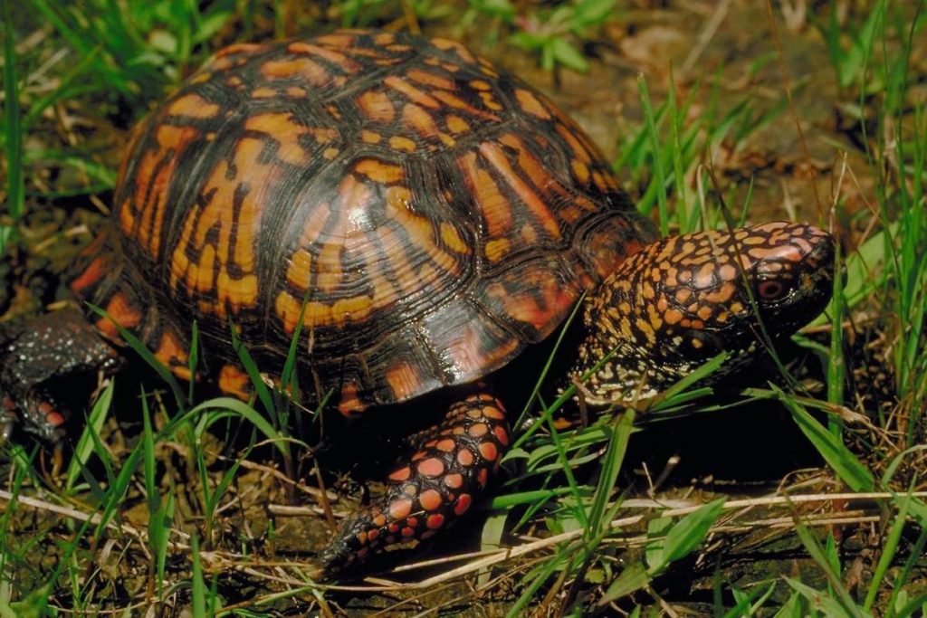 The Eastern Box Turtle is a small to medium-sized turtle with a domed shell that features colorful patterns of yellow, orange, and brown. Its hinged plastron allows it to completely enclose itself within its shell for protection, and its omnivorous diet helps it thrive in the diverse forest ecosystem.
