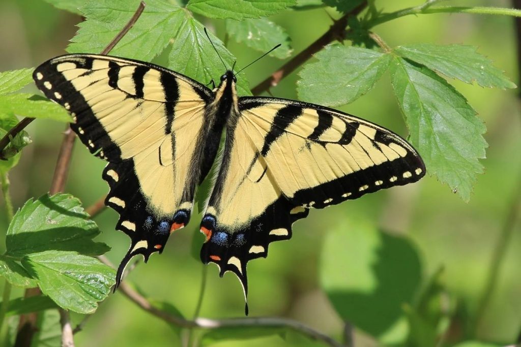 The Eastern Tiger Swallowtail is a large, striking butterfly with yellow wings marked by black stripes. This butterfly’s coloration provides camouflage among the dappled light of the temperate forest, and its ability to feed on nectar from a variety of forest flowers supports its survival in this biome.