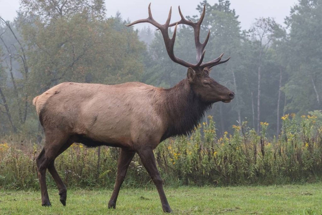 Moose are the largest members of the deer family, with long legs, a humped shoulder, and large, flattened antlers in males. Their ability to feed on a variety of plants and to move easily through a range of environments (including water and deep snow) makes them well suited to northern temperate forests.