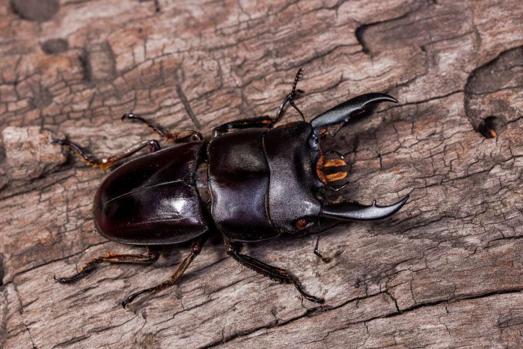 Stag Beetles are large, dark-colored beetles with large mandibles resembling deer antlers. The larvae of these beetles feed on decaying wood, contributing to the decomposition process and nutrient cycling in the temperate forest ecosystem.